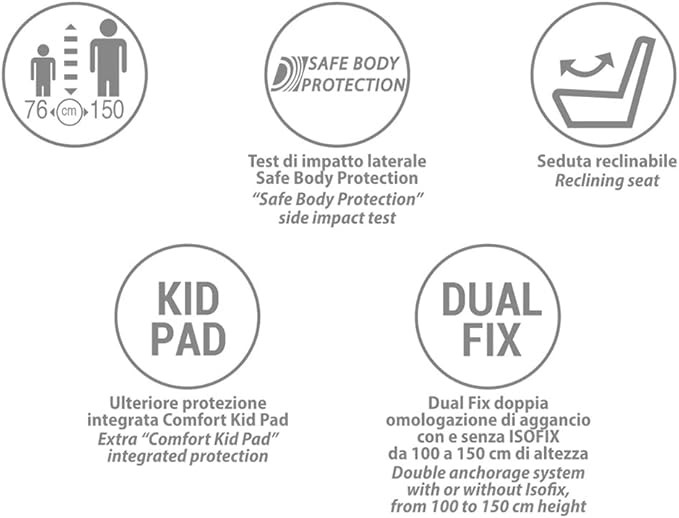Il Foppapedretti Seggiolino Auto Reklino I-Size è progettato per offrire il massimo della sicurezza e del comfort ai bambini dai 15 mesi fino ai 12 anni (76-150 cm di altezza). Conforme alla normativa ECE R129, questo seggiolino garantisce una protezione ottimale grazie al sistema Safe Body Protection. Il fissaggio Dualfix, con opzione Isofix e non, assicura una stabilità impeccabile. Dotato di Comfort Kid Pad per una seduta comoda, il design ergonomico e il sistema reclinabile rendono ogni viaggio un'esperienza sicura e piacevole. La variante Silver aggiunge eleganza e stile.