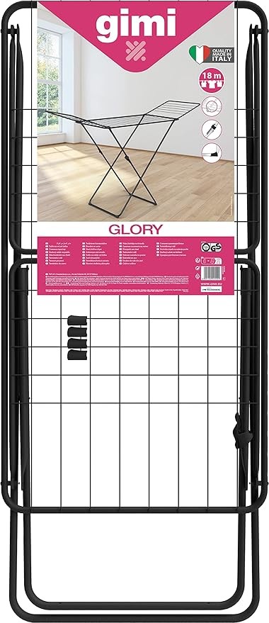 Il Gimi Glory è uno stendibiancheria pratico e resistente, realizzato in lega di acciaio verniciato nero. Offre 18 metri di superficie stendibile, ideale per asciugare comodamente tutto il bucato. Dotato di piedini stabilizzanti antiscivolo e inserti di sicurezza sulle gambe, evita chiusure accidentali durante l’uso. Certificato TUV-GS e prodotto in Italia, garantisce qualità, sicurezza e durata nel tempo.