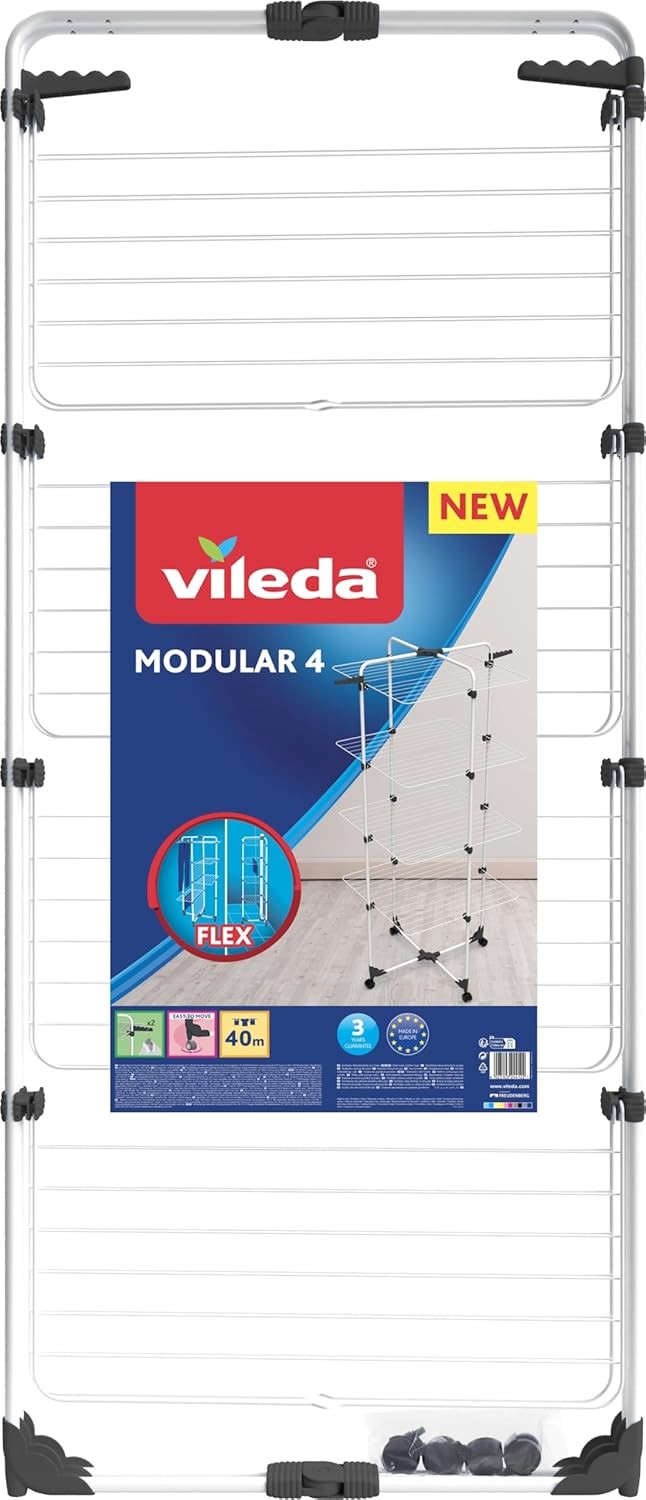 Il Vileda Modular 4 è uno stendibiancheria a torre pratico e versatile, progettato per interni ed esterni. Grazie allo snodo modulabile, può essere utilizzato completamente aperto o richiuso a metà per ridurre l’ingombro a terra. Dotato di ruote piroettanti, si sposta facilmente anche quando è carico. Include ganci porta-grucce e inserti per stabilizzare le griglie, rendendolo ideale per ogni tipo di bucato, dalle camicie ai capi più voluminosi. Pieghevole e compatto, può essere riposto facilmente in spazi ridotti come la doccia.