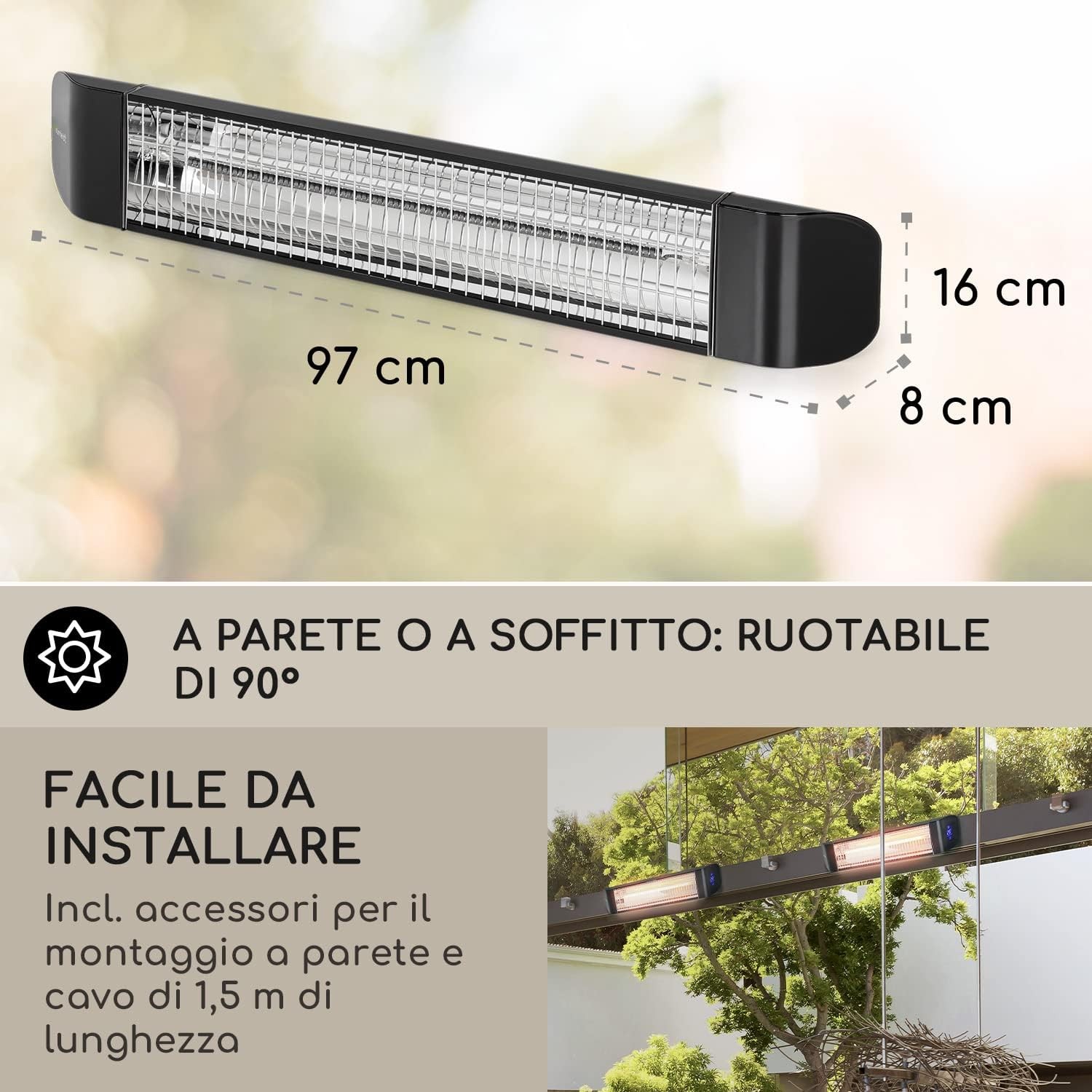 • Montaggio: installazione a soffitto o a parete con l’angolazione desiderata, viti e staffe incluse.