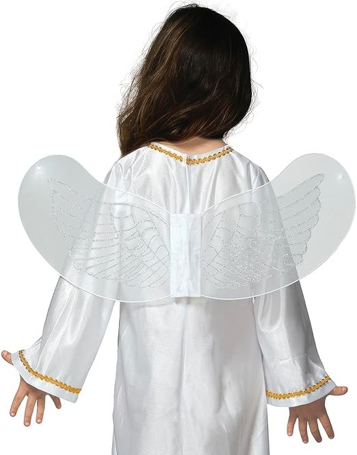 Costume da angelo con abito setoso a tunica bianco lungo con dettaglio passamaneria dorata su collo e polsini. Include ali. Sandali non inclusi. Età 7-9 anni