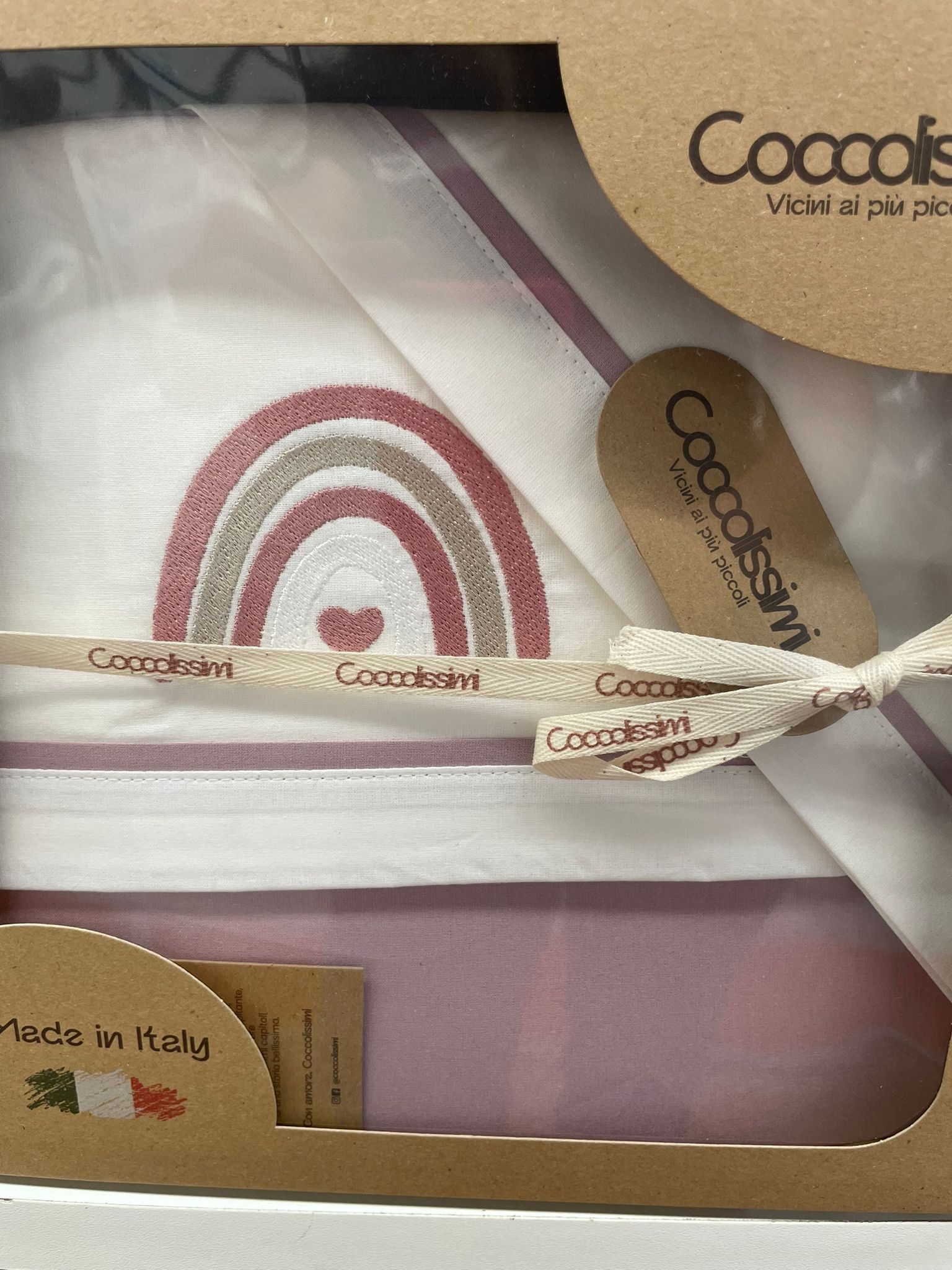 Il completo 3 pezzi cotone lettino Rainbow Old Rose è pensato per rendere il lettino del tuo bambino morbido, accogliente e confortevole. Realizzato in 100% cotone naturale, è traspirante e delicato sulla pelle sensibile del neonato. Il set comprende lenzuolino per carrozzina, lenzuolino sopra e federa, coordinati nei toni del bianco e old rose con dettagli arcobaleno. Interamente Made in Italy, unisce qualità artigianale, comfort e stile per un riposo sereno e piacevole.